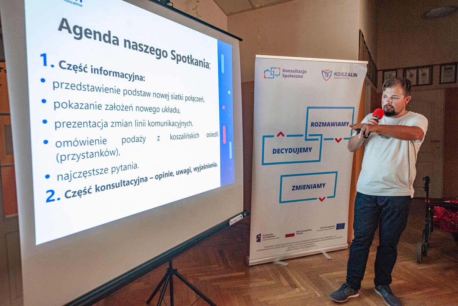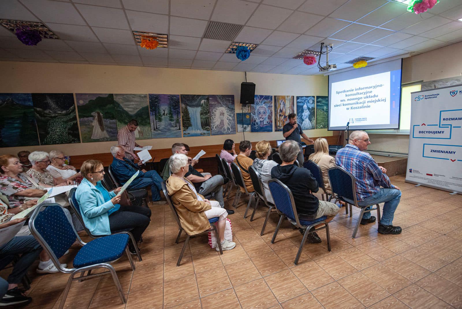 Kolejne spotkanie konsutacyjne w sprawie nowego układu sieci (tras połączeń) komunikacji miejskiej w Koszalinie odbyło się na terenie Osiedla Rokosowo w Klubie Osiedlowym Zacisze w środę 24.07.24 o godzinie 17.00. Łącznie w wydarzeniu wzięło udział blisko 30 osób, w tym Zastępca Prezydenta Miasta pan Tomasz Bernacki, Dyrektor Zarządu Dróg i Transportu pani Anna Grabuszyńska-Hewelt, pan Piotr Badowski pracownik Zarządu Dróg i Transportu, przedstawiciele MZK Sp. z o. o., przedstawiciele Rad Osiedli Rokosowa i Lubiatowa, pracownicy Gabinetu Prezydenta Miasta oraz mieszkańcy Koszalina.