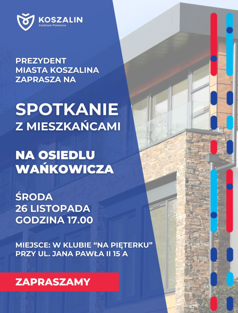 Spotkanie  z mieszkańcami osiedla Wańkowicza odbędzie 26 listopada (środa) o godz. 17:00 w Klubie "Na Pięterku" (przy ul. Jana Pawła II 15A).